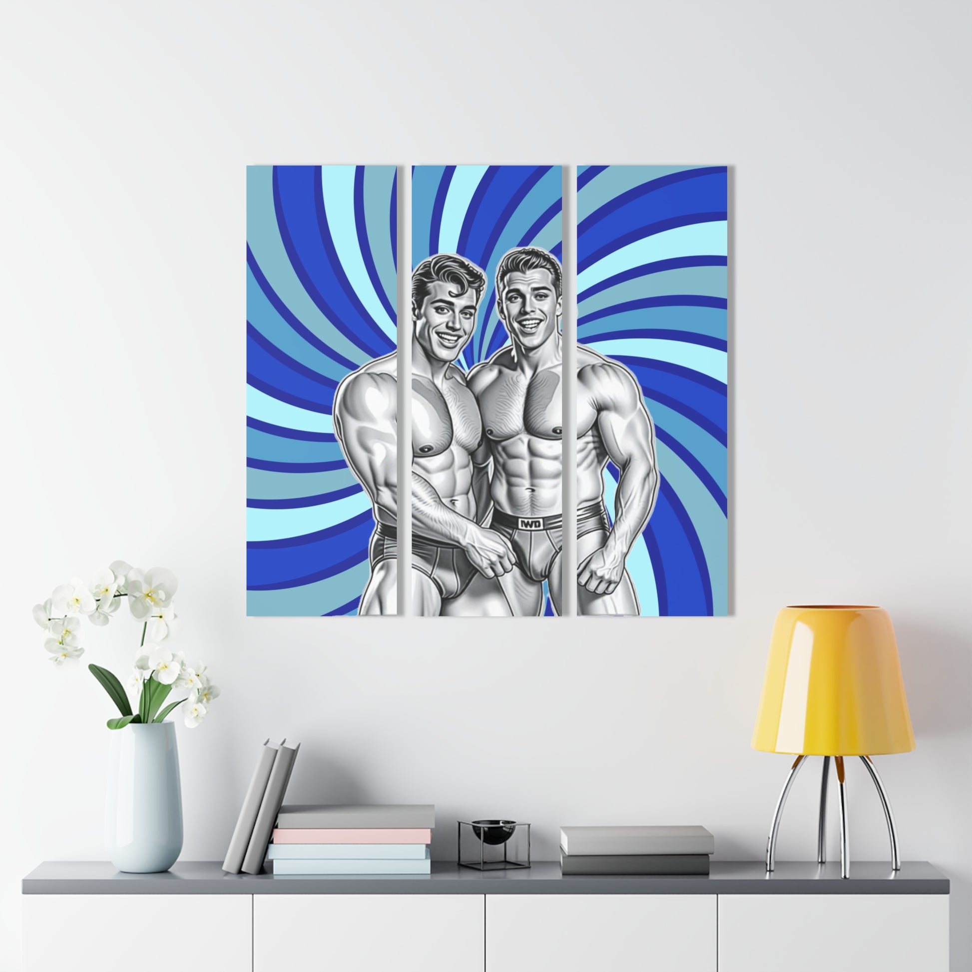 Meet the muscle duo from our original image,"Boys will be Boy's" with a psycedelic twist in “Swirl Boys”. This high-impact, three-panel acrylic print featuring two grayscale beefcakes basking in a radiant swirl of electric blues. Bold, playful, and unapologetically queer, this 36" x 12" triptych sets the tone for the Beefcakes universe — where camp meets confidence and every wall gets a wink. Mounted with a sleek French cleat system for easy hanging and maximum drama. Perfect for living rooms, gyms, studios, or anywhere you want a splash of sass and strength.